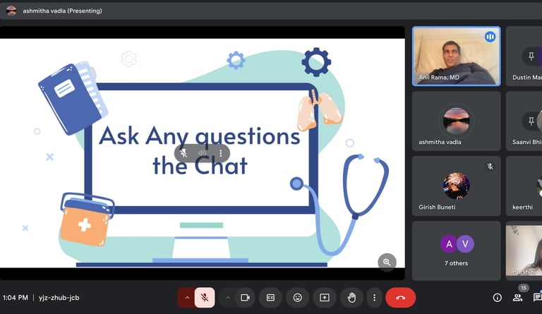On September 28, 2024 we hosted a guest speaker event with a renowned neurologist Dr.Rama. During our webinar Dr.Rama shared his inspiring medical journey starting from UC Berkley, continuing onto earning his Doctor of Medicine and Master of Public Health from George Washington University, followed by his residency and fellowship at Stanford Medical Center. Dr.Rama also discussed his numerous of publications in the field of sleep medicine including some of his favorite research projects he worked on. Along with this Dr.Rama spoke about his prestigious Stanford Distinguished Service Award. Lastly, Dr.Rama also shared his journey of opening up his own clinic, Sleep and Brain, located in Saratoga California. The event provided a unique opportunity to explore the pathway to success in medicine through Dr. Rama's experiences and achievements!